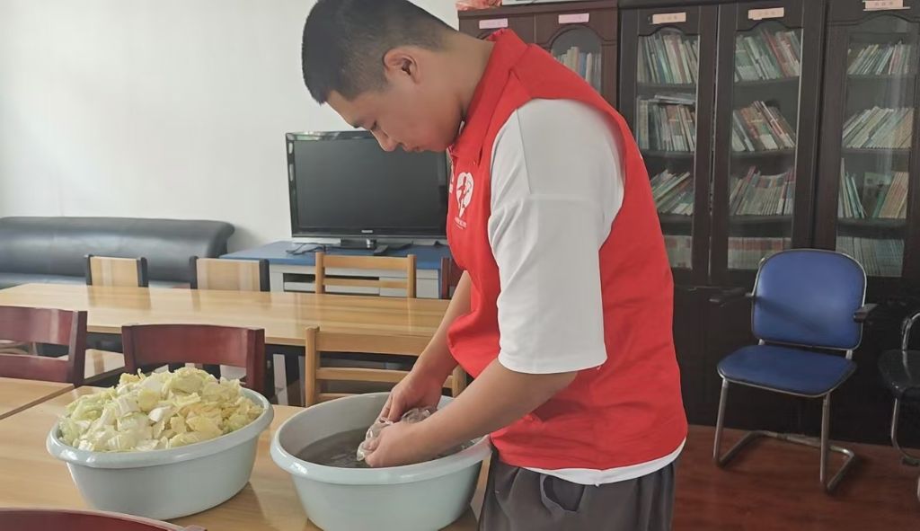 一大早,社工一行人就携带着食材来到幸福院,同村里的工作人员、志愿者一起处理食材、调料,一起切肉、摘菜、刷锅。中午10点30分准时开火,由村里的志愿者掌勺,热油、煸肉、下调料......经过了一个小时的等待,一锅热气腾腾、香味十足的猪肉粉皮炖菜已做好,由社工一碗碗端到老人面前,老人吃过后连连夸赞,脸上露出幸福的笑容。