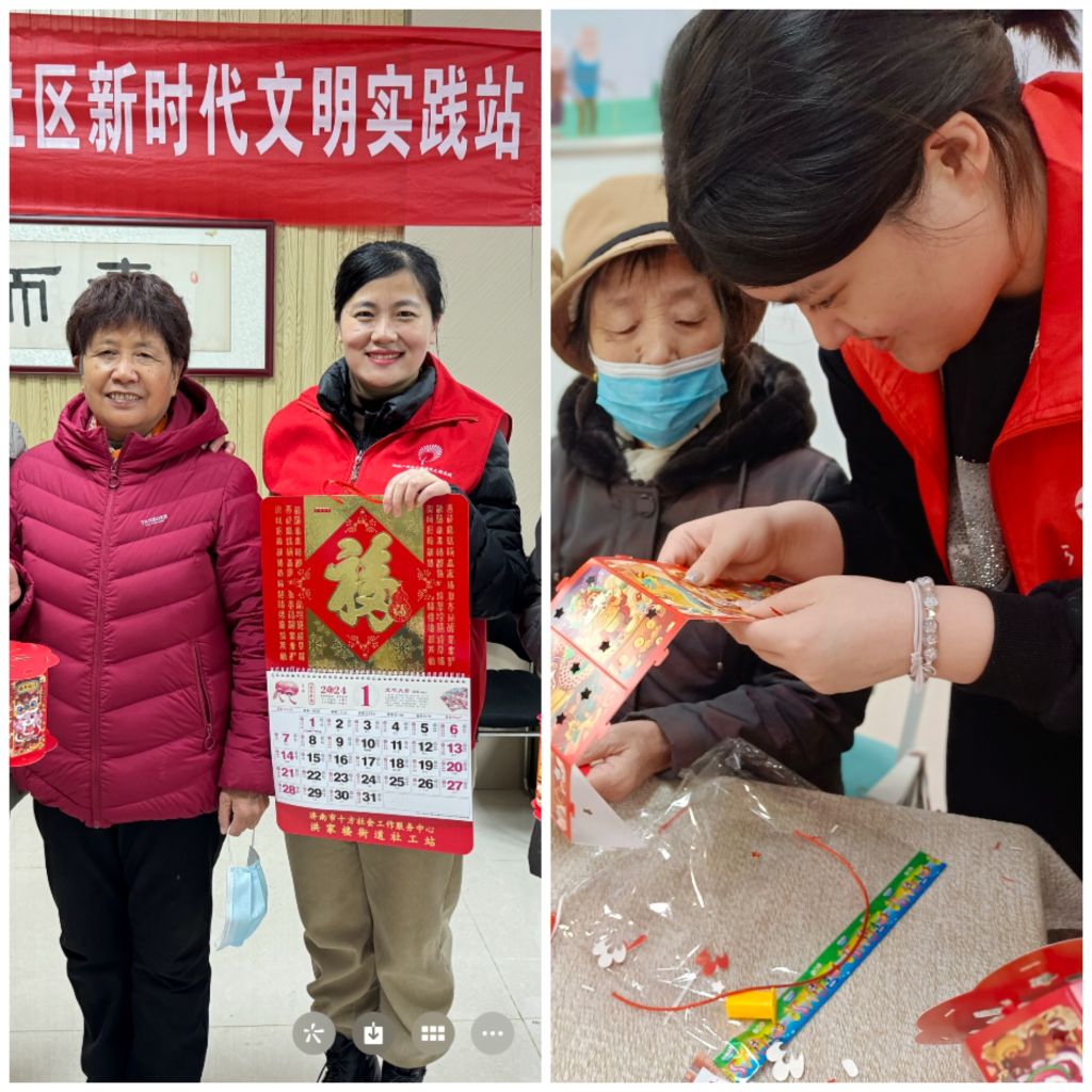 活动现场,洪家楼社工站准备了花灯手工材料,包括灯笼框架、灯笼插画、串灯、提绳等。社工们为大家详细讲解了制作手工花灯的步骤。大家按照制作步骤去串、贴、缠,不起眼的手工材料经过大家灵巧地制作和装饰,一个个灯笼很快制作完成。刘阿姨打开花灯的开关看着地面上倒映的“龙年大吉”四个字高兴地说:“这小灯笼真精致,一下子就让我想到小时候过年拿着花灯到处跑的时候了。”其他的叔叔阿姨看着手里诞生的漂亮花灯每个人都爱不释手,一起展示分享着自己的作品。在大家都沉浸在欢快的气氛中时,社工们抱着新年挂历开始给参与活动的叔叔阿姨送上了新年的祝福。一本本带着烫金福字的挂历依次送到了大家的手里,“新年还没到,你们就开始给我们发挂历了,真是太贴心了。”叔叔阿姨们拿着挂历,看了又看,高兴的说道。