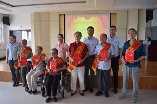 活动分为四个环节,第一环节社会福利中心王院长发表讲话,对于公益演出人员表示欢迎。第二环节表彰积极参与到社工服务的住民,并在服务中不断发挥主动性的老人表示感谢,并为其颁发“手牵手 心连心”爱心服务队聘书,鼓励住民主动走出来,融入到福利中心大家庭,发挥第一批爱心服务队成员的带动作用。第三环节由住民代表发言,说出在接受社工服务后的心声。第四环节是圆梦艺术团带来的形式多样的公益演出,其中一位住民在演出人员的带动下,在工作人员的鼓励下热情高涨,主动参与其中演出当中,为大家演唱一首戏曲,赢得了阵阵掌声。