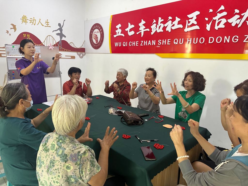 稍后进行的串珠手工中,社工带领小组成员进行“悦动指尖”的手指操练习,充分调动了手指的灵活性和手眼协调性。手指操为指关节的运动做了充足的准备,接下来大家飞线走珠,将学习过程中的难点通过互相交流讨论逐步攻破,不一会精致的串珠杯垫就跃然出现。大家分分感慨刚才还散落珠盘的各色彩珠,不一会就变成了精美的工艺品,真是成就感满满。