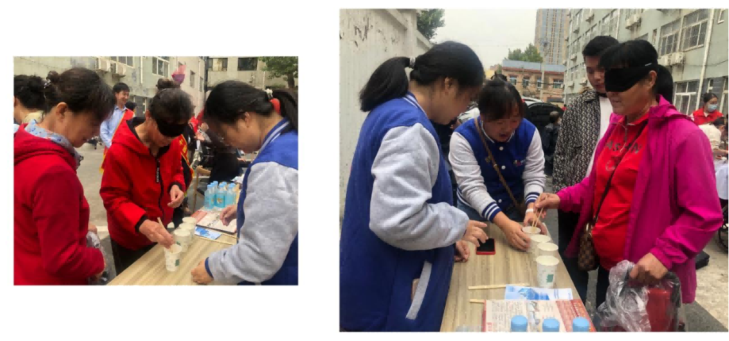 听完防诈骗的知识后,又来到我们的游戏摊位,社工向老人说明了游戏规则:戴上眼罩,在社工提示下夹花生米放到纸杯里。老人理解了规则,兴致勃勃的开始了,有的老人在指挥下夹了一个就放弃了,理由是太难了夹不住;还有的老人有了经验后甚至不需要社工提示就可以自己夹……