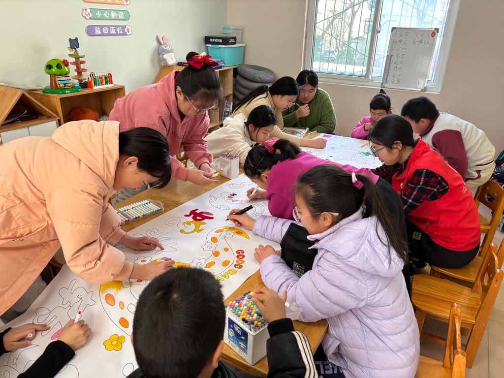 破冰活动结束后,社工们与孩子们一起进行了蛇年新春画卷绘制。整个绘画过程充满欢声笑语,孩子们充分发挥想象力,有的描绘灵动的蛇舞,有的勾勒喜庆的春节传统元素,如福字、烟花等。他们相互交流、彼此协作,遇到困难时,身边的小伙伴总会热情地伸出援手,给予建议和帮助。社工们也积极参与其中,给予孩子们必要的指导和鼓励,确保绘画顺利进行。