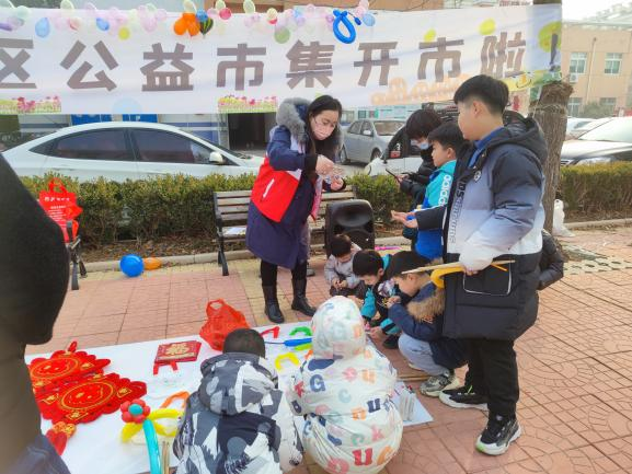 公益集市中设有暖心义诊区、便民服务区、儿童跳蚤市场、儿童架子鼓、创意美术、新春送福、政策解读、非遗剪纸等内容,在寒冷的冬日中也能居民感受到暖意,并积极参与其中。