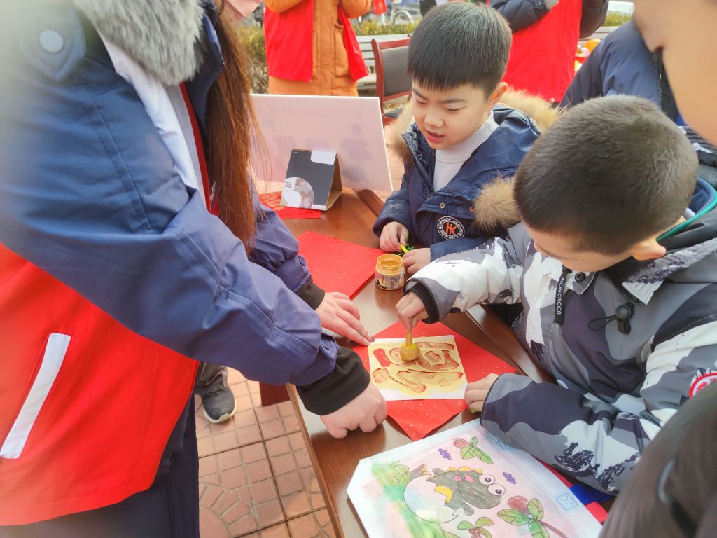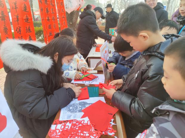 在非遗剪纸区,志愿者指导居民如何剪纸,并为他们讲解剪纸的各种知识,在一双双巧手下,各种各样的小动物跃然在纸上浮现,栩栩如生,还有对新年美好的祝福和祈愿也在纸上展现出来,显然是一幅艺术的景色。