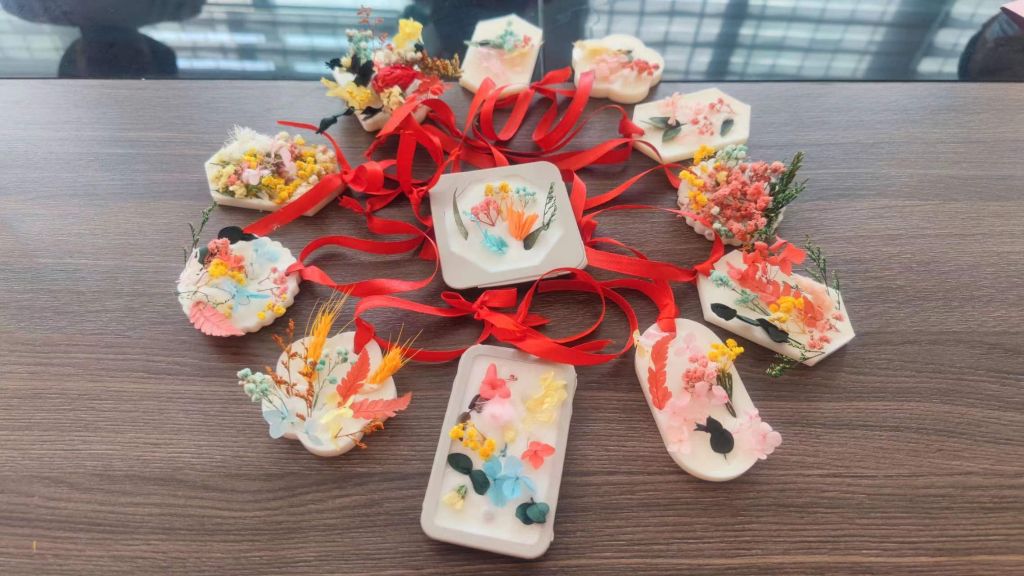 活动吸引了众多家庭成员的参与,大家围坐一堂有说有笑,温馨和谐的氛围弥漫整个活动室。活动开始大家在社工的引导下选择自己喜欢的花材和模具,社工将提前调配好的蜡油倒入模具中,冷却后大家开始发挥自己的创意给自己的香薰添加花材并进行设计摆放,每一片干花的摆放,每一句讨论的话语都蕴含着参与者对母亲深深的爱意与祝福。