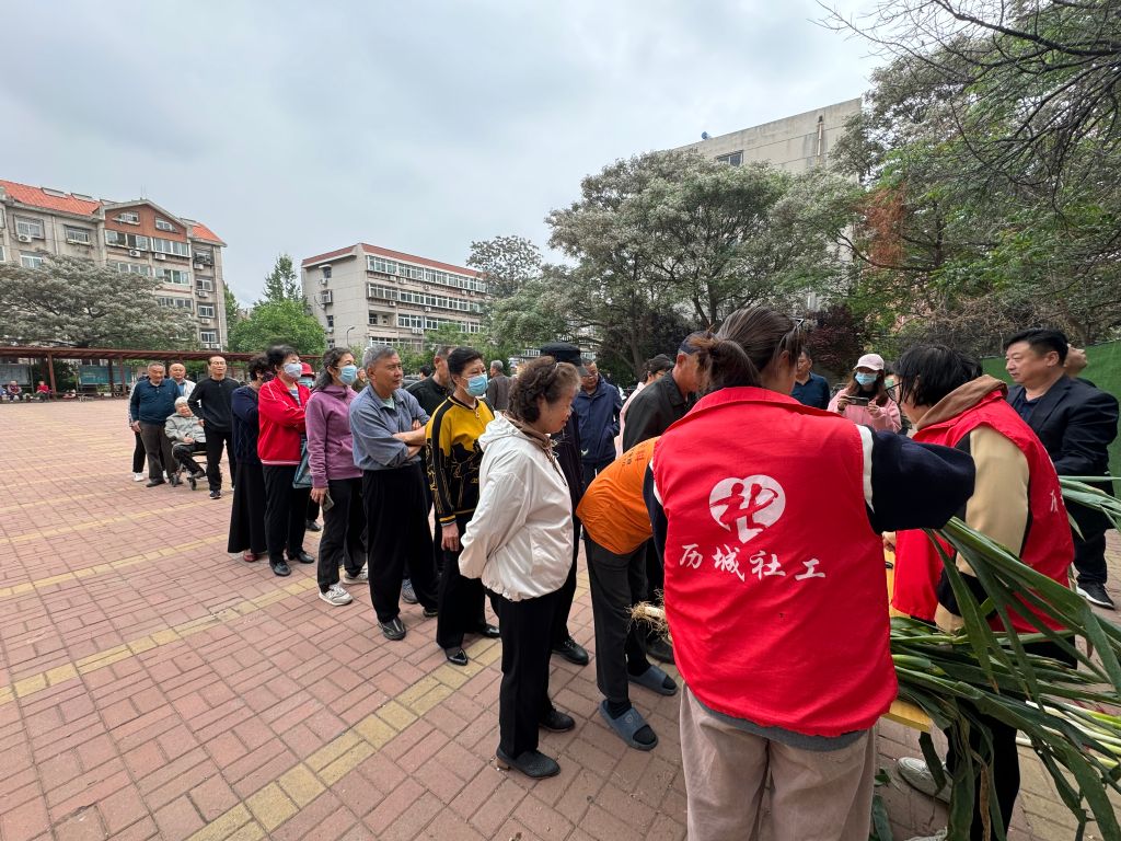 在化纤社区免费蔬菜派送点,十几捆还带着露珠的新鲜蔬菜堆在地上,加上几张简单的桌子就成了派送点的签到处。桌子另一边等待领取蔬菜的队伍弯弯扭扭一眼望不到头。“快来领蔬菜吧,街道社工站给我们发福利了”,居民们奔走相告,气氛非常火爆。