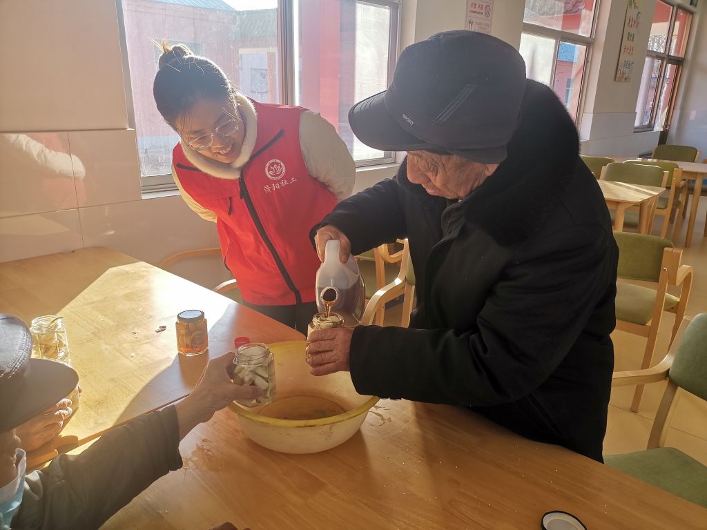 活动当天,驻站社工和志愿者们提前准备好了新鲜的大蒜、陈醋和密封罐。首先,社工向老人们介绍了腊八节的由来、民间传说以及各地的风俗习惯,让老人们对这个传统节日有了更深的了解。随后,社工邀请老人们分享他们年轻时过腊八节的记忆和故事。老人们纷纷打开了话匣子,有的讲述了自己家里制作腊八粥的传统方法,有的回忆起小时候跟随父母腌制腊八蒜的情景,还有的分享了自己家多独特的腊八节,让年轻一代了解到了不同时期传统节日的习俗。