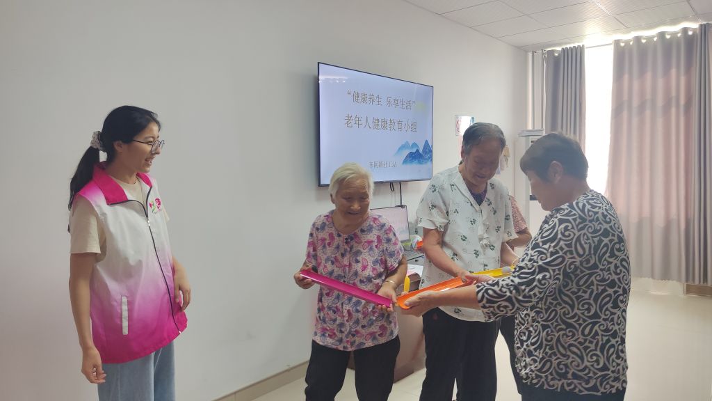 本次教育小组共计五节,第一节主题为“开心见面会”,社工通过自我介绍+破冰游戏等方式,加深组员之间的认识,密切组员之间的沟通交流,增强组员之间的凝聚力。第二节主题为“经络六拍操 舒经络促健康”,在本节活动中,社工通过“珠行千里”游戏活跃课堂氛围,拉近组员之间的距离,通过“经络六拍操”的学习,向组员介绍身体穴位的具体位置及养生功效,带领组员一起动起来,拍经络,促健康!小暑至,夏季养生正当时。带领全体组员观看养生讲座视频《夏季话养生》,邀请组员分享养生心得和独家养生小妙招,共享夏季养生知识,健康过夏日。第三节活动主题为“健康养生 健康身体吃出来”,本节活动通过向组员介绍夏季老年人养生菜谱、夏季老年人饮食注意事项等养生知识,结合夏季农村应季蔬果,向老年人展示蔬果的做法,丰富老年人餐桌,通过学习夏季老年人饮食注意事项,帮助老年人精准避雷夏季饮食误区,健健康康、舒舒服服过夏天!第四节活动主题为“健康手指操 双手动起来”,本节活动的重点带领组员共同学习《健康手指操》,通过活动手指及手部穴位,锻炼手部灵活性的同时强心健脑,一举多得。第五节活动主题为“快乐886”,在社工的带领下,大家一起回忆小组活动的点点滴滴,共话学习心得和成长,处理好小组离别情绪,虽然小组活动结束,但健康的养生知识和养生习惯会一直陪伴她们度过健健康康、快快乐乐晚年时光。