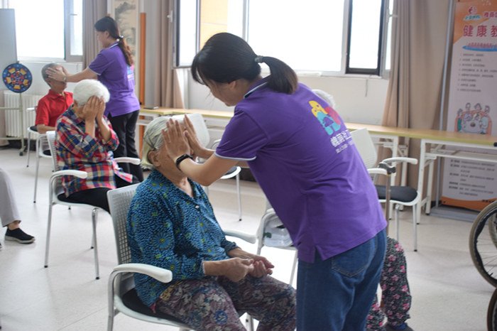 本着循序渐进的原则,社工首先带领老人们做了眼保健操,老人们跟随着音乐,闭上双眼,按摩着眼部穴位,老人表情平静,呼吸放松,完全沉浸在这缓慢祥和的氛围之中......音乐结束,老人们缓缓睁开双眼,社工们主动将双手焐热,为老人舒缓眼部肌肤,老人们都笑着称赞社工像自己的儿女一样贴心~