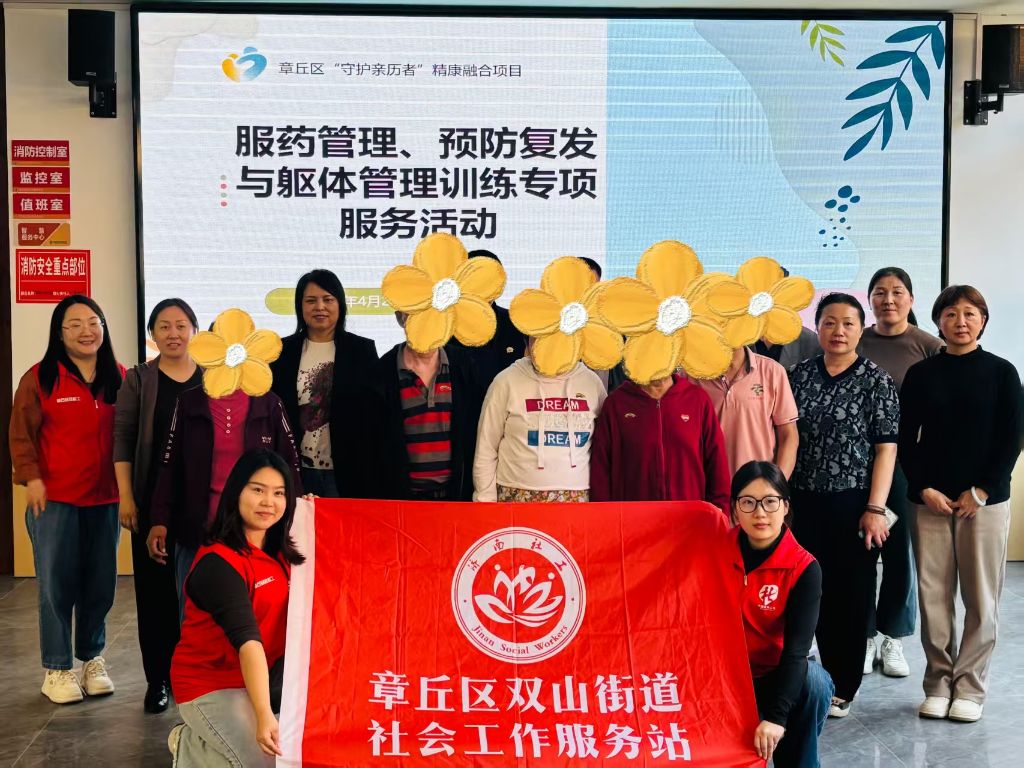 为帮助精神障碍患者重建生活信心、提升社会适应能力,4月22日,双山街道社工站联合章丘区民政局“守护亲历者”精康融合项目组织,在章丘区养老服务中心开展“服药管理、预防复发与躯体管理训练专项服务”活动。本次活动融合专业医疗知识与人文关怀,通过"专业讲座+游戏互动"形式,收获亲历者及家属的广泛好评,助力构建“医院-社区-家庭”三位一体服务网络。