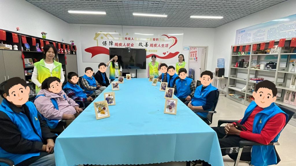在手工制作环节,残疾朋友们展现出了令人钦佩的专注与创造力。在社工的耐心指导下,他们小心翼翼地将干花一朵朵粘贴在相框上,每一朵花的摆放都经过精心构思,每一笔色彩的搭配都流露出他们对美的追求。虽然他们的动作可能不如常人那样敏捷,但他们的眼神中闪烁着对生活的热爱和对艺术的执着。在他们的巧手下,原本普通的相框逐渐变得生动起来,仿佛每一朵干花都在诉说着一个关于坚持与希望的故事。