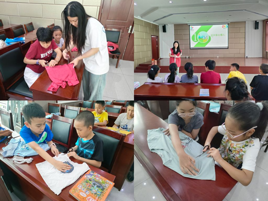 一群怀揣着大大创意的巧手,将日常中的废旧物品赋予了新生。他们自选主题,从卡纸边角料到塑料瓶、从旧衣物到旧鞋盒,每一件看似无用的物品,在孩子们灵巧的双手下,化身为一件件既精美又实用的作品。在“旧衣改造”环节中,小营员团队合作裁剪布料、打结、拼接,不用一针一线,旧T恤摇身一变成为精美帆布包,牛仔裤则变成了独一无二的牛仔花艺术品。