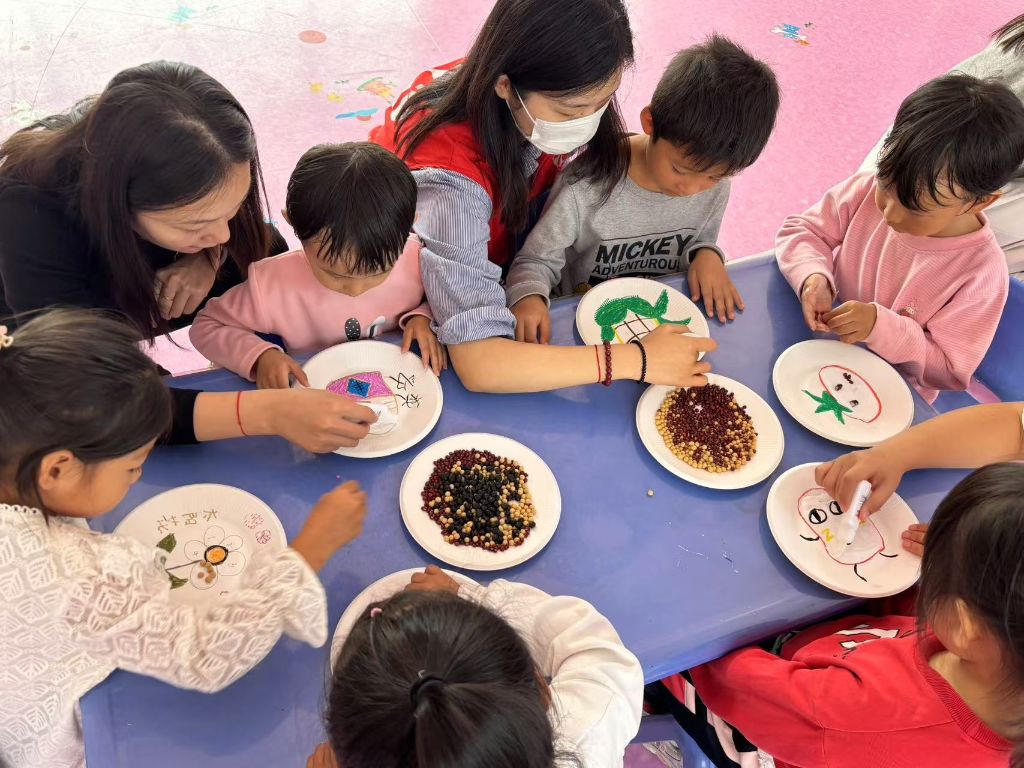 接下来,孩子们又参与制作了手工盘子画,此次游戏锻炼了孩子们的动手能力。他们用社工准备的谷物粘在盘子上的规定区域,通过这个活动,孩子们在发挥创造力的同时,也对各种食物有了更深的认识和喜爱。