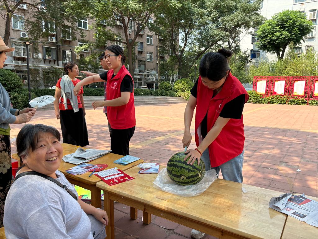 制作完漆扇后,社工抱出早就冰镇好的西瓜邀请居民一起吃瓜,红艳艳的西瓜为酷暑带来了许多清凉。与此同时社工向居民们普及了夏至的节气知识并提醒大家注意防暑,清淡饮食。