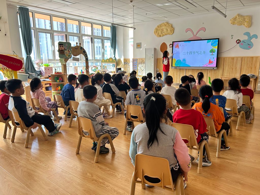 活动开始社工首先带领小朋友们回顾上节课学习的内容,借助节气接龙的小游戏让小朋友们加深对于立秋、处暑、白露、秋分、寒露、霜降这六个秋天节气的印象,社工和小朋友们一起重温了秋天的手势舞,小朋友们兴高采烈的伴随节拍挥舞起双手。紧接着本次学习正式开始,社工向小朋友们深入简出地讲解了冬天的六个节气,分别是:立冬、小雪、大雪、冬至、小寒、大寒,并探讨了其气候特征在农业生产和现代日常生活等方面的应用。通过经典古诗词的诵读讲解,揭示了二十四节气不仅是中国农民的重要农事指南,更是中国传统文化的瑰宝。此外,社工还借助教室内已有的教学粘土模型——饺子引导孩子们感受时令的变化。在学习过程中,大家通过趣味问答、脑筋急转弯、诗词接龙的知识进行互动帮助他们加深对冬季节气的知识的记忆。