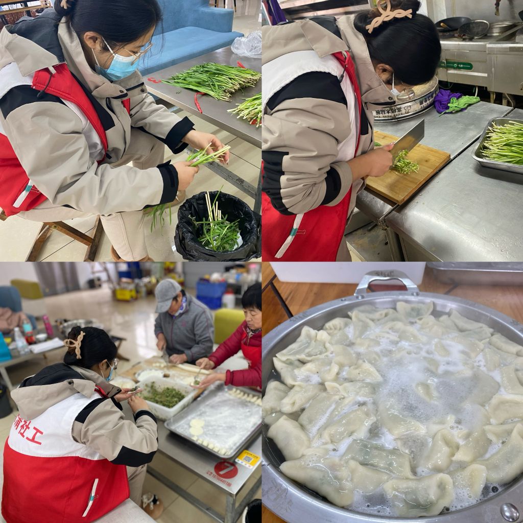 活动开始之前,社工提前选购好菜、肉等食材和调料,做好各项准备工作。活动中,社工和志愿者切菜调馅、和面擀皮儿,不同的环节分工协作,灵巧的双手上下翻飞。大家各显身手,用自己拿手的方式包着各式各样的饺子,现场洋溢着快乐的气氛。不一会儿功夫,一个个皮薄馅大的饺子就呈现在众人面前。冬风瑟瑟,路上行人匆匆,黄河人家店铺内却热闹非凡。