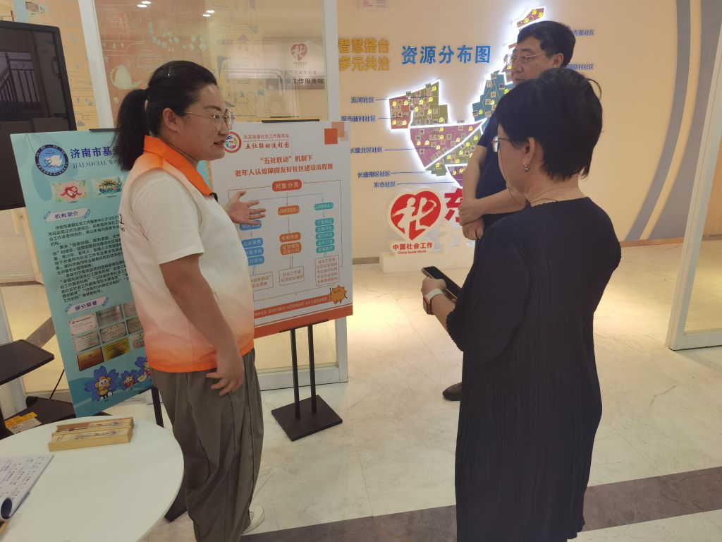 调研组一行听取了东关街道社工站老年社会工作的发展历程及现阶段服务开展情况,重点了解了“情系桑榆,大爱泺河”老年人社区参与项目、“泺忆家”认知症友好社区建设项目、“忆相伴”认知症家属赋能项目等特色服务品牌。总干事李明叶向调研组详细介绍了“五社联动”机制下老年人认知障碍友好社区建设流程,对认知障碍领域服务对象分类、服务分层的具体操作方法作出解读,并介绍了《认知症老人照护小贴士》、黄手环等品牌宣传品。