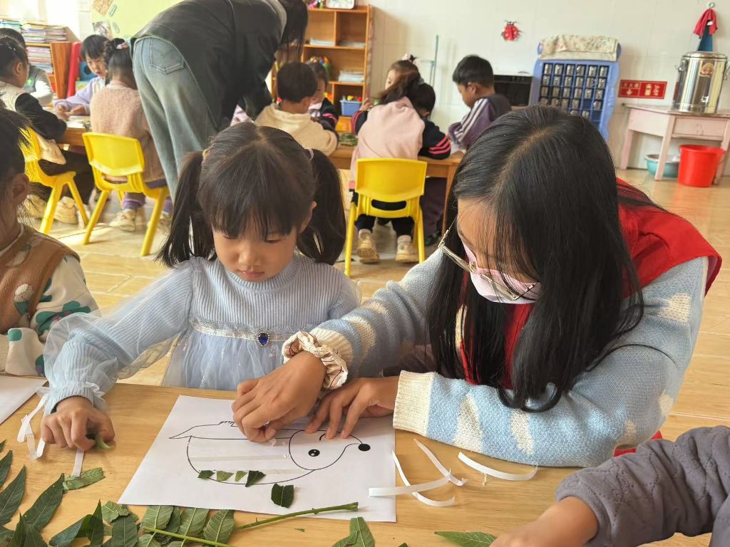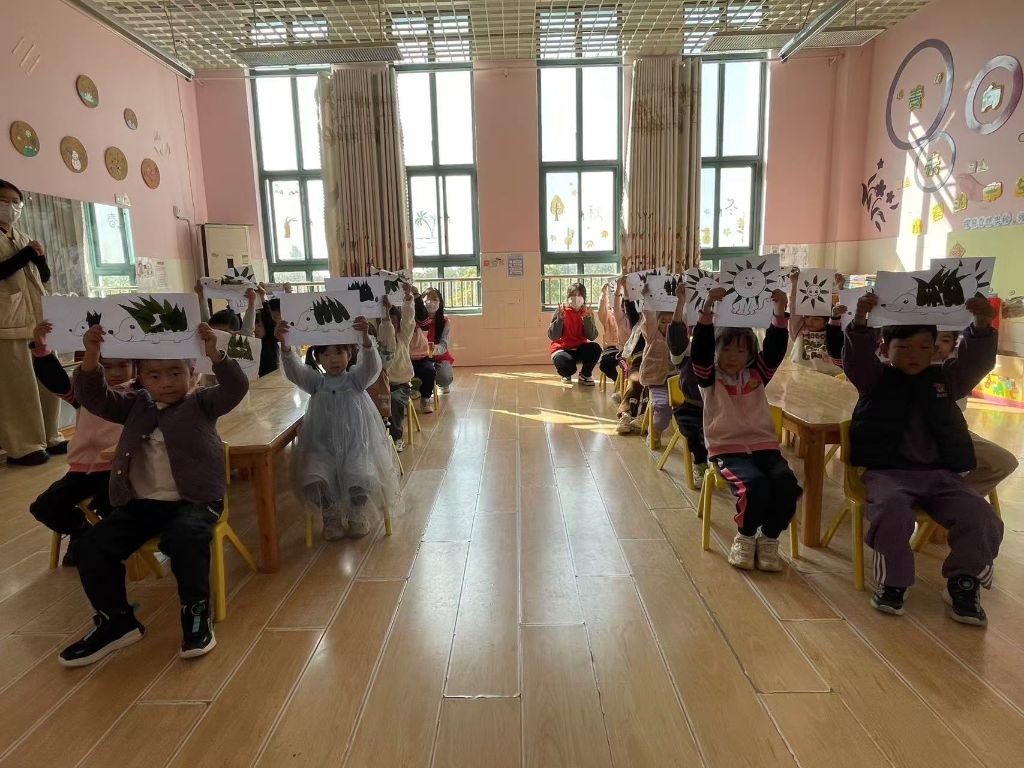 随后,社工带领孩子们进入第二个环节——“霜降树叶画”。孩子们在社工的指导下,用双面胶、树叶粘在社工发的A4纸上,制作出完整的小狮子、太阳、刺猬、恐龙等。孩子们的创造力得到了充分的发挥,他们互相展示自己的作品,脸上洋溢着自豪的笑容。