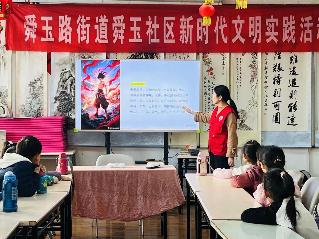 活动初始,社工以最近爆火的动画电影《哪吒》为切入点,带领孩子们观看了AI工具生产的图片和视频,初步认识了AI制图工具——可灵和即梦的基本信息和功能,并带领孩子们学习如何使用关键词生成图片,激发了孩子们对AI绘图工具的兴趣。