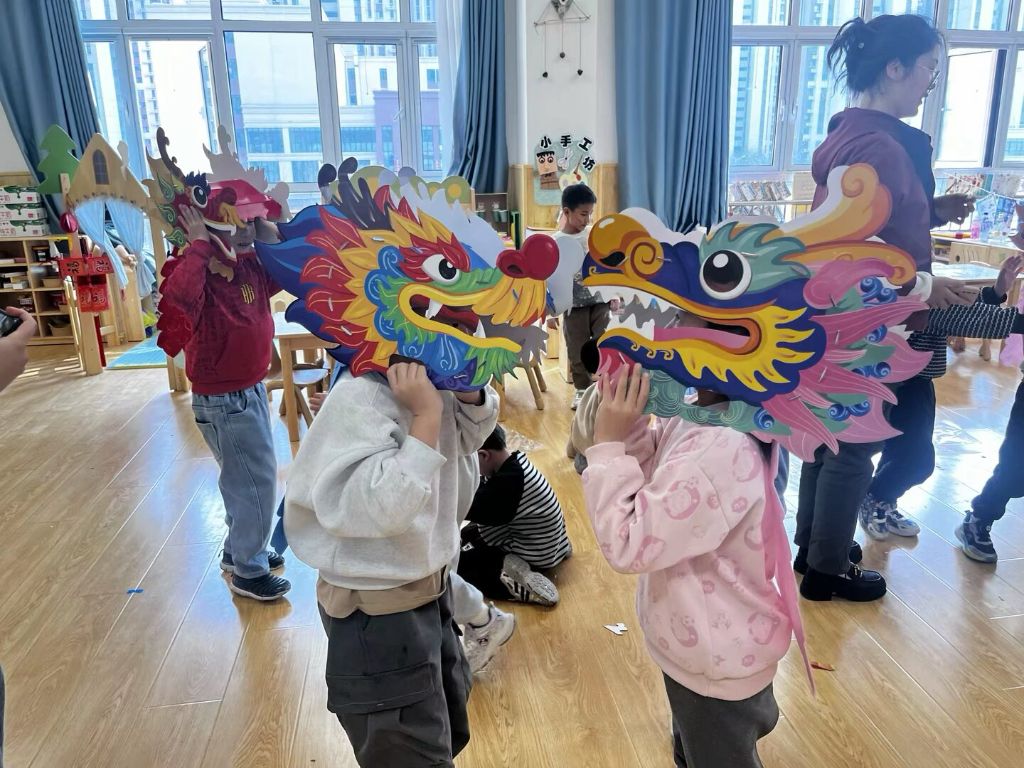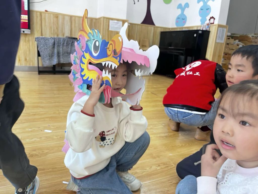 制作完成后,孩子们迫不及待地拿起自己制作的舞龙头,模仿着舞龙的动作,在场地中欢快地奔跑起来。一条条“小龙”在孩子们的舞动下活灵活现,现场欢声笑语不断,仿佛一场热闹的民俗庆典。