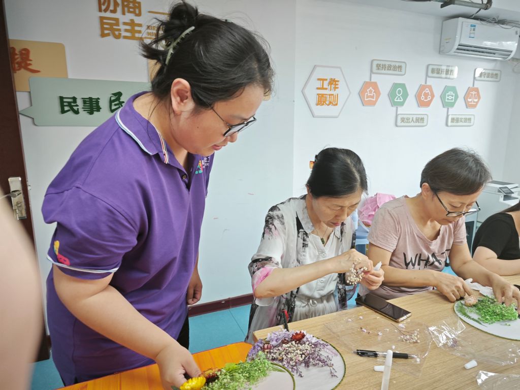 优势视角理论提倡关注人的内在力量和优势资源,强调关注服务对象自身及其环境中的优势和资源而非其问题和病理,着重于挖掘服务对象的优势。兴福街道社工站应用优势视角理论,将关注点放在发挥社区老年居民的在制作手工方面的优势,挖掘居民的志愿服务潜能,将手工制作与志愿服务巧妙结合,充分发挥老年居民的志愿服务精神。本次活动的内容是制作干花手工扇子,在志愿者们的巧手中一片片叶、一株株花在空白的扇子上逐渐显现成一幅幅画,一次次黏贴收获一张张笑颜。扇子制作好后,志愿者将扇子交由社工在后续入户中赠给困弱人群,传递友爱互助的志愿服务精神。以志愿者制作手工制品赠给辖区困弱人群的形式进行志愿服务的形式,帮助了老年人更好的适应老年生活,是退休后的一种“积极入世”,让老年人感受到志愿服务的带给人的获得感和满足感,亦是一种志愿服务精神的传递。