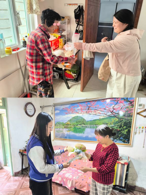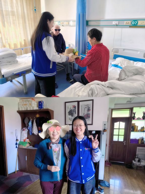 入户访组员,访出归属感。为让每位服务对象都能感受到浓浓的节日氛围,现场活动结束后,社工专程前往未到场的阿姨家中进行入户走访,在卉阿姨(化名)家,社工运用会谈技巧深入了解她当前的生活现状、精神状态,阿姨表示很感动“感谢政府时刻记挂着我们这些群体”。兰阿姨(化名)两口因腿疼入院疗养,社工前往病房进行探望,倾听了她在生活、情感寄托等方面的问题,社工鼓励她要树立健康快乐的生活信念,并将带有节日祝福的鲜花和草帽交到阿姨手中。