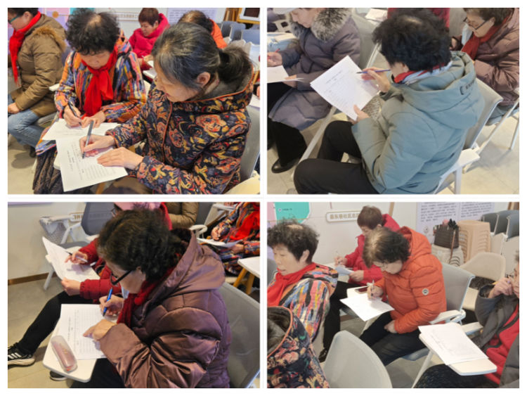 最后,社工引导小组成员完成了各项评估表的填写。这些评估表不仅是对他们学习成果的客观检验,更是对他们在这个小组中共同度过的宝贵时光的深情回忆。“在家里一个人也没人说话,每次来这都刚开心了来。”一位组员的感慨让社工深感五味杂陈,既为他们的孤独感到心酸,也为他们能在这里找到归属和乐趣感到由衷的欣慰。在填写评估表的过程中,其他阿姨们也纷纷分享了自己的感受。她们表示,通过参与小组活动,不仅丰富了自己的知识,更重要的是结识了许多志同道合的朋友。这些珍贵的经历和友情将成为她们未来生活中的宝贵财富,让她们感受到生活的美好和充实。