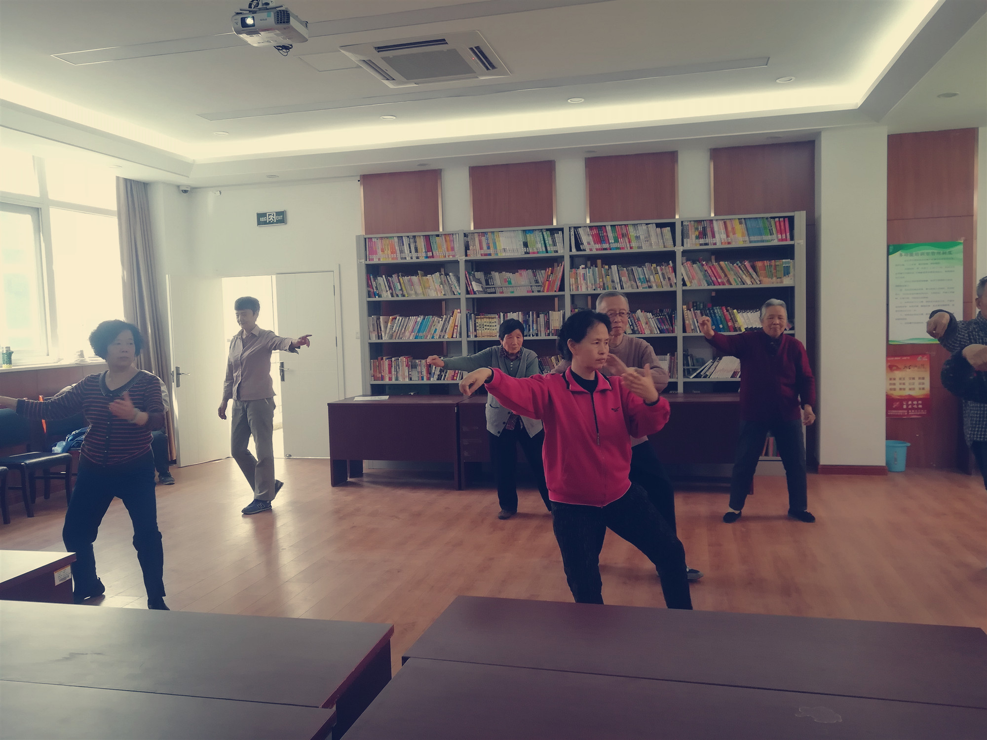 本节活动主要学习太极拳中的单鞭和云手,志愿者王老师先是带领组员重复前面所学的动作,巩固旧知识。随后跟随视频的播放,王老师带领组员们学习新招式,分解动作,掌握动作要领。通过视频播放、志愿者的讲解督促,社工发现小组成员们较之上次学习热情高涨,进步速度快。