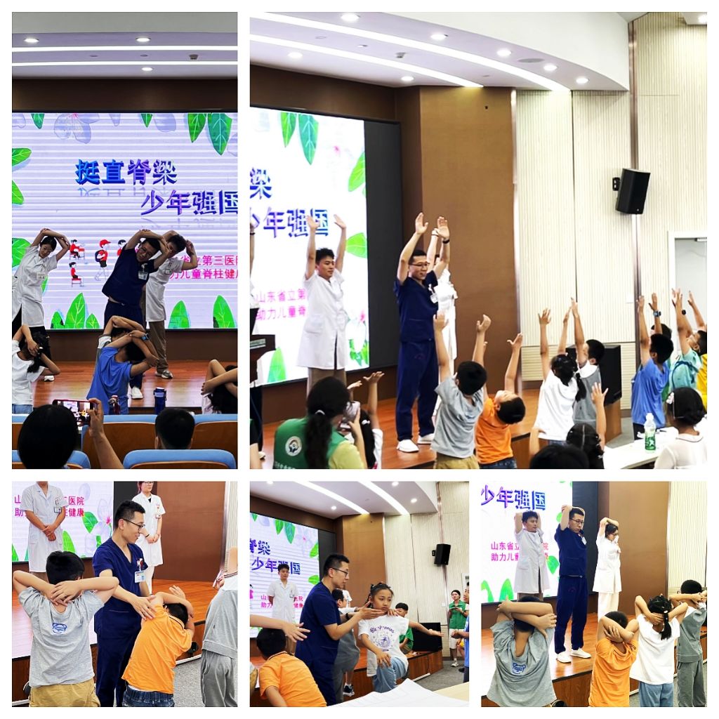 精神心理科王玥为孩子们带来了一场“心灵之旅”体验活动,通过对家族家谱知识介绍和带领大家绘制家谱的过程,为孩子们提供了了解自己家庭、探究祖辈的故事契机。在随后的“社工课堂”上,社工通过游戏的方式锻炼营员们的反应力和专注力,进一步促进营员之间的互动交流。“急救初体验”环节中,急诊科张新庆为孩子们详细讲解了创伤急救的知识和包扎、转运技巧,演示了如何正确使用绷带、纱布等急救材料。这一环节的目标是增强营员们的安全意识,提高他们在紧急情况下自救和互救的能力。康复中心刘宝祥带领孩子们一起做预防脊柱侧弯的健康操,包括抱膝转体、侧身下腰、固髂后仰、双手托天、侧向摇摆、观天倒腰、立地转身七个动作,为孩子们现场演示、评估、纠正,与孩子们积极互动,共同练习,让职工家长们意识到脊柱健康的重要性,注重身体健康,积极锻炼,强身健体。少年强则中国强,“脊”不可失,共同守护青少年脊柱健康,挺直脊梁,展翅飞翔!活动最后,社工带领孩子们开心玩游戏,赢奖品。