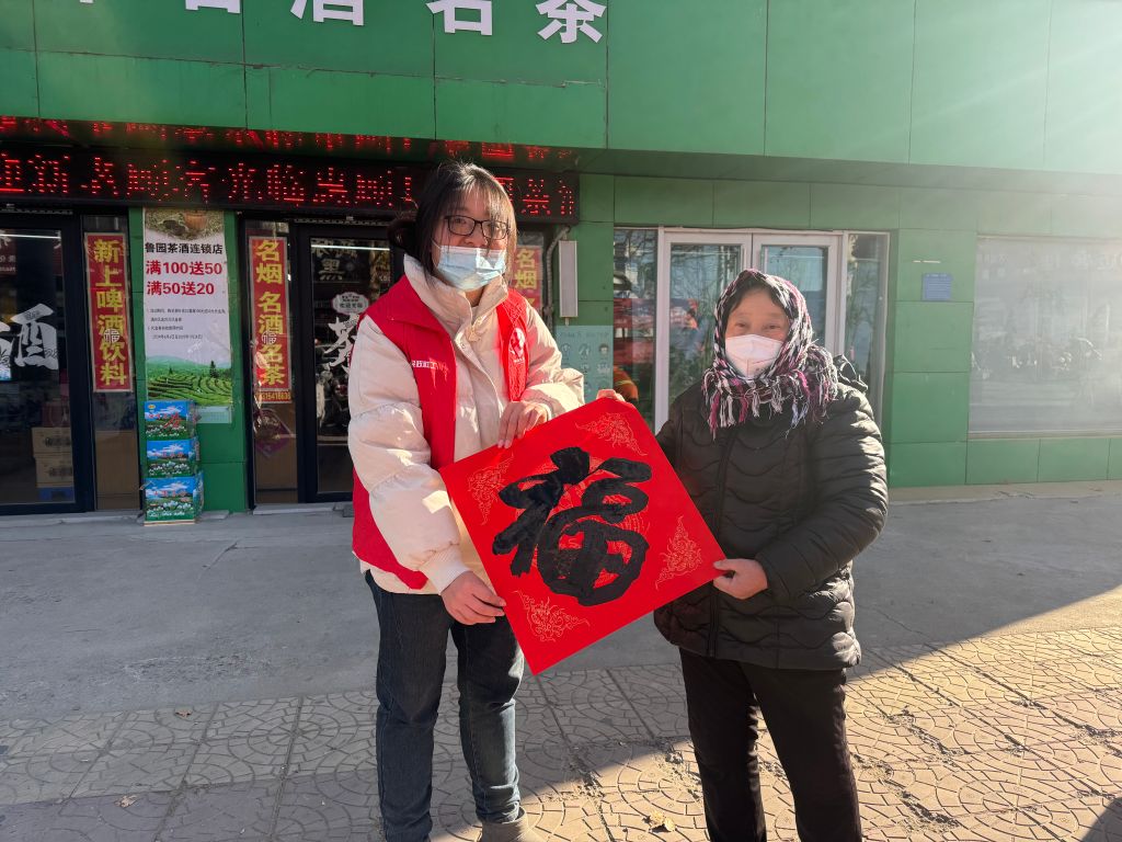 同时,社工还邀请章丘区书法协会高官寨分会会长刘祖新,高官寨书法爱好者孟庆常、卢文君为大家现场挥墨送出新春祝福。“看到红红的春联才感觉更有年味,我选的福字正好贴在我的新家,这个活动太好了”一位在现场领到心仪福字的大姐开心的向大家炫耀。红红的福字和对联,让大家在寒冬感受到党和政府的新春祝福。