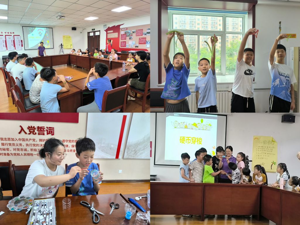 “硬币怎样才能从一个比它本身直径小的洞里穿过?”伴随着这一提问,社工利用“硬币穿梭”小实验,向“成长N次方”夏令营的成员们演示硬币穿过比它小的纸张的过程,“只需要把纸张对折向两侧拉扯,便可以穿过小孔,这利用的是纸张的张力。”看着这神奇的一幕,大家既兴奋又好奇,没想到科学实验如此贴近生活、如此有趣。