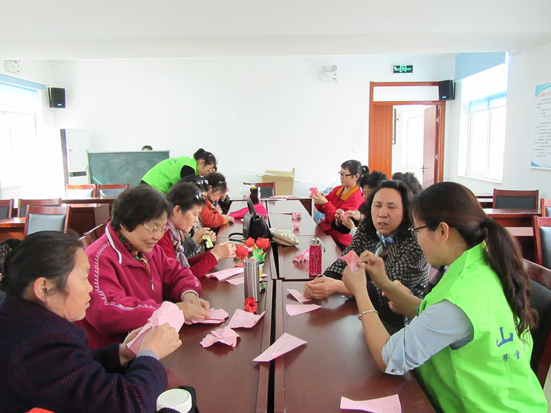 接着,项目社工分发彩纸给组员,让组员自行回顾并尝试折叠。期间项目社工在学员中间来回转动,解决学员疑问并提供相应指导。学的比较快的阿姨也主动帮助其他的阿姨……玫瑰的折纸比较复杂,中间有很多重叠的褶痕,老年人带着老花镜折纸的过程比较累,发现这一情况后,山东财经大学志愿者带领老年人做了眼保健操,放松情绪,缓解眼睛疲劳。