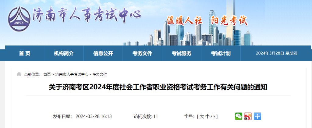 关于济南考区2024年度社会工作者职业资格考试考务工作有关问题的通知
