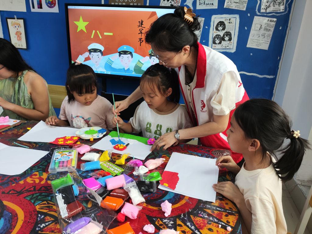 活动中,“平安使者”志愿者为辖区儿童讲解了“八一”建军节的由来,并带领大家制作创意彩泥画,揉、搓、捏、贴…孩子们发挥想象力,给作品搭配了各种元素,每个作品都饱含着孩子们对祖国和军人的美好祝愿和祝福。经过孩子们的认真制作一幅幅红色作品呈现在大家面前,鲜红色的红星闪闪发光,每一幅作品都闪烁着初心使命的光辉。彤彤说:“通过志愿者姐姐的讲解,我切实体会到今天的幸福生活来之不易,正是有了解放军叔叔们的无私奉献,冲锋在前,才有了如今繁荣昌盛的祖国。作为新时代的少年,我们要学习他们的革命精神,将来也要为祖国的发展贡献自己的力量!”