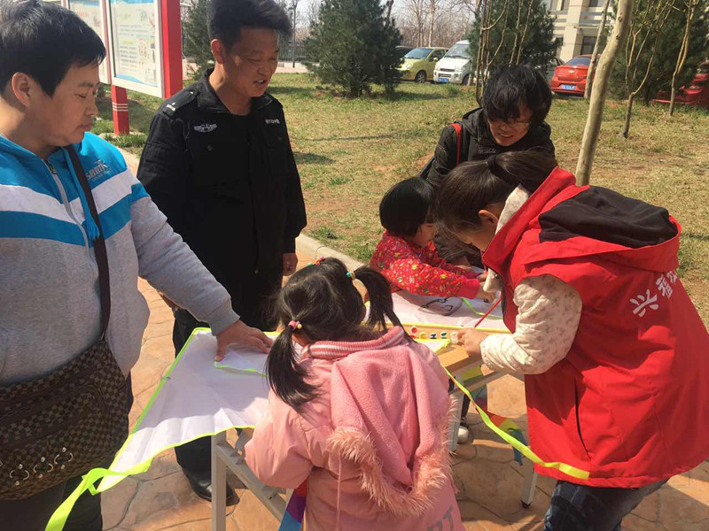 下午一点半,我们工作人员将活动现场布置好,悬挂好条幅,搬好桌子,为居民准备好画笔、颜料、风筝等。