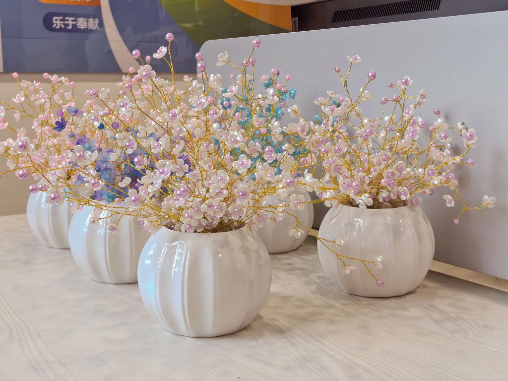活动伊始,社工首先为大家介绍本次小组活动的主题“巧手串珠,穿出未来”,并为大家发放串珠材料包,鼓励心智障碍者组员大胆去触碰材料包,感受材料包中每一样手工制作材料的不同触感,辨别不同手工制作材料的形状及用途。在组员们对本次小组活动有了基础的了解之后,社工为大家详细讲解串珠花束的制作方法,并与志愿者一起协助不太擅长的心智障碍者组员制作串珠花束。在大家的努力下,本节小组完成串珠作品6盆。大多数组员们掌握了串珠的制作方法,虽然有个别组员不能够独立制作一盆完整的串珠花束作品,但每一位组员都投入到手工制作之中,充分体验自己动手所带来的成就感与效能感。
