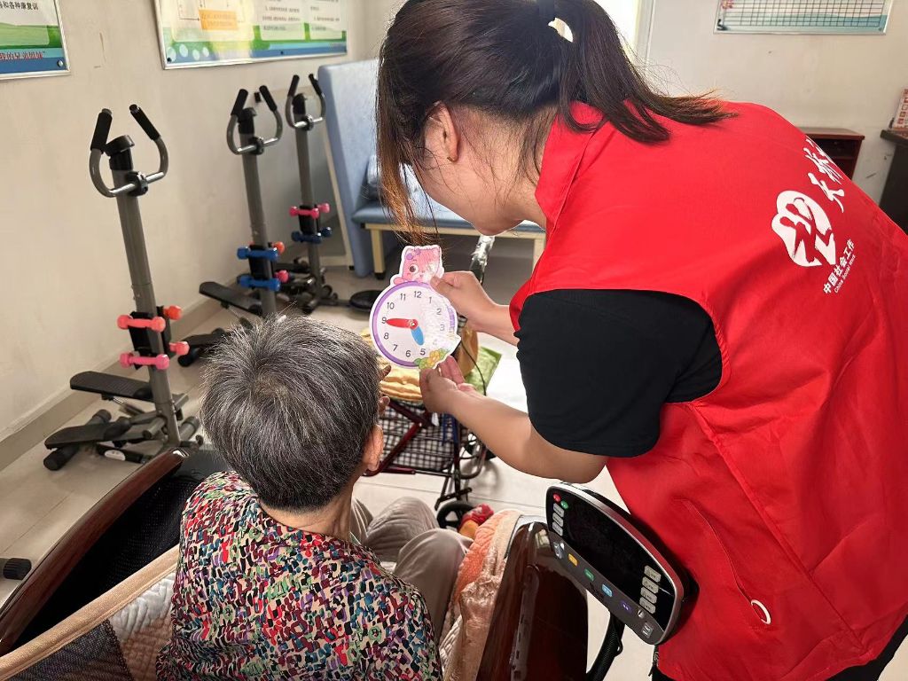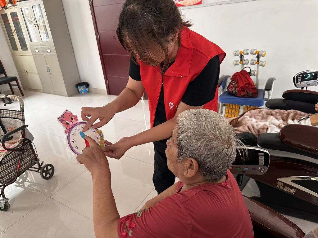 为了让居民们更直观地了解阿兹海默症对日常生活的影响,社工们特别组织了一场钟表认知活动。社工们引导老年人识别时间,并通过互动游戏的方式,让老年人在轻松愉快的氛围中锻炼大脑。这一环节不仅增强了老年人对时间的感知能力,还提高了他们的认知灵活性和记忆力。