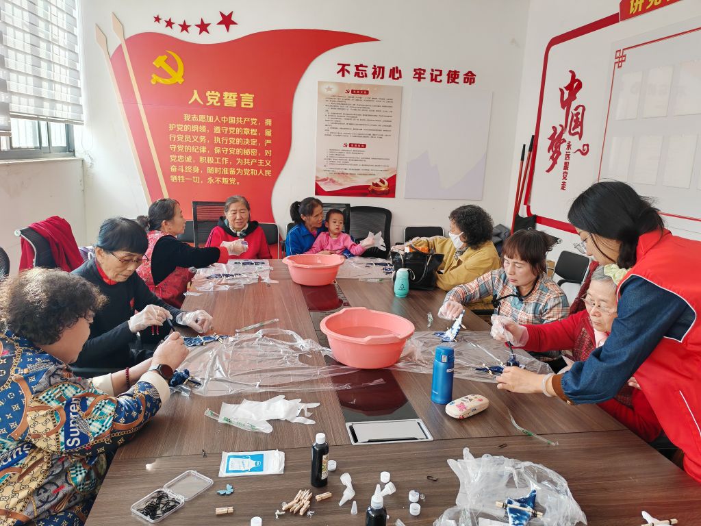 活动现场,社工们早早地布置好了场地,准备了丰富的扎染材料和工具。小组成员陆续到来,脸上洋溢着期待的笑容。活动开始后,社工首先详细介绍了扎染的历史、文化和制作方法;随后,在社工的协助下,老人们开始动手制作自己的扎染手绢。他们有的小心翼翼地折叠布料,有的则用绳子、夹子等工具紧紧扎住布料的各个部分,期待在后续的染色过程中创造出独一无二的图案。社工们穿梭在人群中,耐心解答老年人提出的问题,帮助他们解决操作过程中遇到的困难。活动过程中,社工们不仅关注老人们的制作进度,还与他们亲切交流,倾听他们的故事和感受。有的老人分享了自己年轻时的手工经历,有的则表达了对这次活动的喜爱和感激,欢声笑语回荡在整个活动现场。