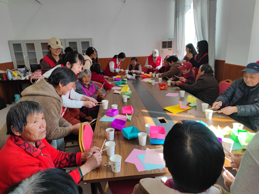 活动一开始,社工和志愿者们便与老人们围坐在一起,开始了有趣的折纸教学。一张张彩纸在手中翻飞,不一会儿,栩栩如生的小船、花篮便跃然眼前。老人们虽然动作稍慢,但在志愿者们的耐心指导下,每个人都完成了自己的作品。看着手中的折纸,老人们脸上洋溢着满足的笑容,仿佛回到了童年的快乐时光。“这花篮真好看,我要带回去给孙子看看!”一位奶奶开心地说道。小小的折纸不仅拉近了彼此的距离,更让老人们感受到了陪伴的温暖。