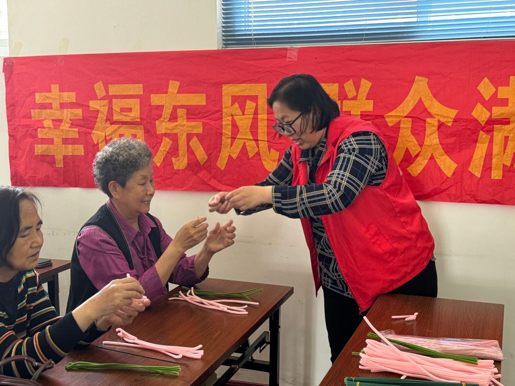看着自己的劳动成果,居民们都开心地笑了,有的甚至做了四五朵,还组成了花束。随着花瓣扭得越来越多,居民们的手指也变的越发熟练了,他们纷纷向社工展示自己的花朵,社工也及时的予以回应。扭扭棒花朵的制作过程虽然不难,但是特别需要耐心,有些居民做的较慢,先做完的人可以教做的慢的人,在互帮互助的过程中,加强了彼此情感的联系。