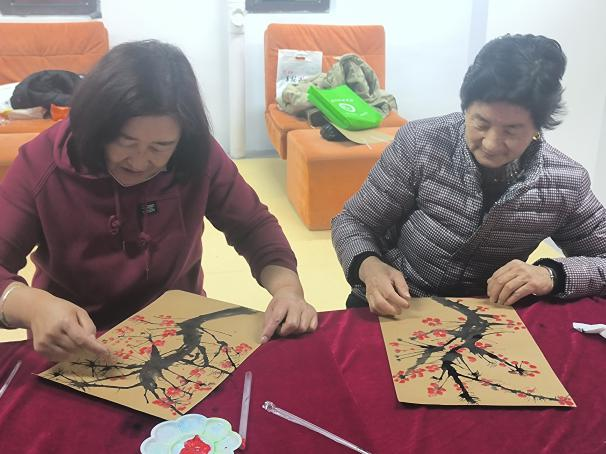 活动现场,社工首先为辖区居民介绍了“大雪”的历史渊源、气象变化等方面的知识。随后给大家介绍本次活动的吹墨梅画,即将墨汁滴一些在纸上,用嘴吹代替画笔作画。吹墨梅花画中的线条是由墨珠直接吹出,花瓣用手指沾染颜料点缀形成。随后志愿者为社区居民分发纸张、墨汁、颜料等作画所需要的材料。拿到材料后,阿姨和奶奶们纷纷投入到制作自己的吹墨画的过程中,饱蘸浓墨,梅花初现,一吹一点,一张张构思独特和充满创造力的吹墨梅花便显现出来了。对于那些对手工艺充满热情但又有为难情绪的老年人,社工会采用激励的方法,引导他们一步一步的完成制作,让其体验到成功的乐趣。最终,在社工和志愿者的帮助之下,每个人都完成了他们的创作,当看到自己最后的成品时,大家也都感到无比的欣喜。
