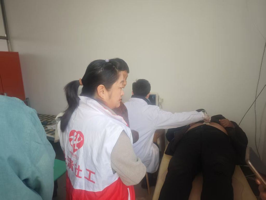 活动现场,医护人员和社工们早早布置好场地,有序引导老人进行各项检查。测血压、血糖的区域,医护人员一边操作仪器,一边耐心询问老人的日常饮食和用药情况,并给予针对性的健康建议。在B超检查区域,医护人员操作着精密的仪器,仔细地为老人们检查身体脏器状况。每一个画面都被认真解读,对于发现的潜在问题,医生们耐心地向老人解释,并给出专业的建议。一旁的心电图检查处同样忙碌,老人们安静地躺在检查床上,医护人员专注地观察着心电图的波动曲线,不放过任何一个异常信号,为老人的心脏健康把关。在测量视力时,社工们手中拿着指示棒,耐心引导老人测完视力。在测量身高时,社工们贴心地帮助老人站直身体,确保数据的准确,还会笑着和老人打趣,缓解他们的紧张情绪。