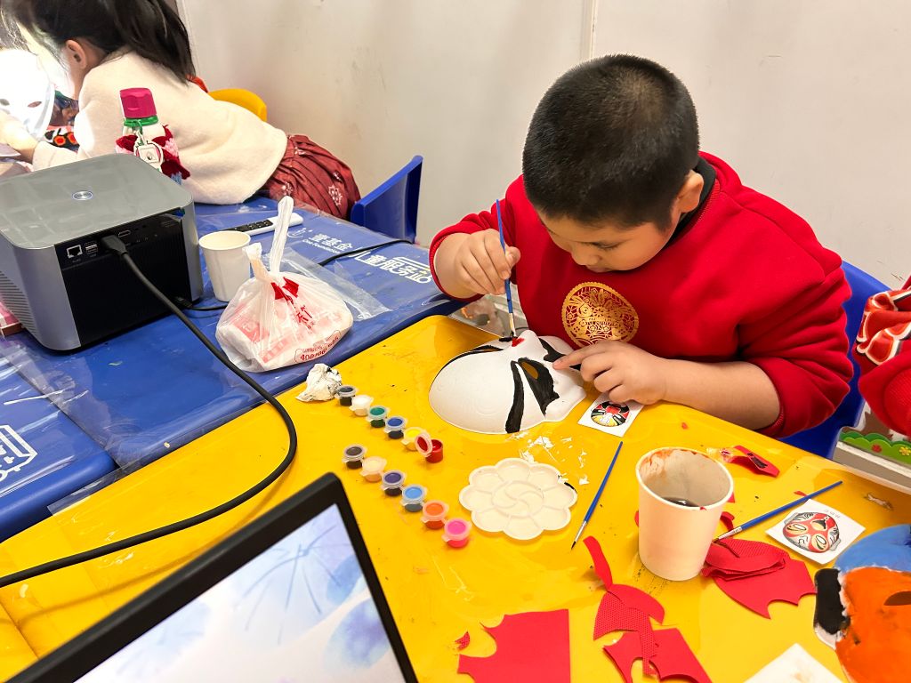 在彩绘脸谱环节中,脸谱是京剧表演中不可或缺的元素,每一幅脸谱都代表着不同的角色性格和命运。在社工的指导和示范下,孩子们开始动手绘制脸谱,他们有的参考了脸谱的常见图案,有的根据自己的想象力和喜好创作出独特的脸谱。首先孩子们细心描绘,使用黑色颜料笔在面具上勾勒出脸谱的轮廓,然后使用各种颜料为脸谱的各个部分填充颜色,最后孩子们还对脸谱进行了细节修饰,如添加图案、花纹等,让脸谱更具个性和创意。手中的画笔在脸谱上流转,仿佛在勾勒出千变万化的角色性格。