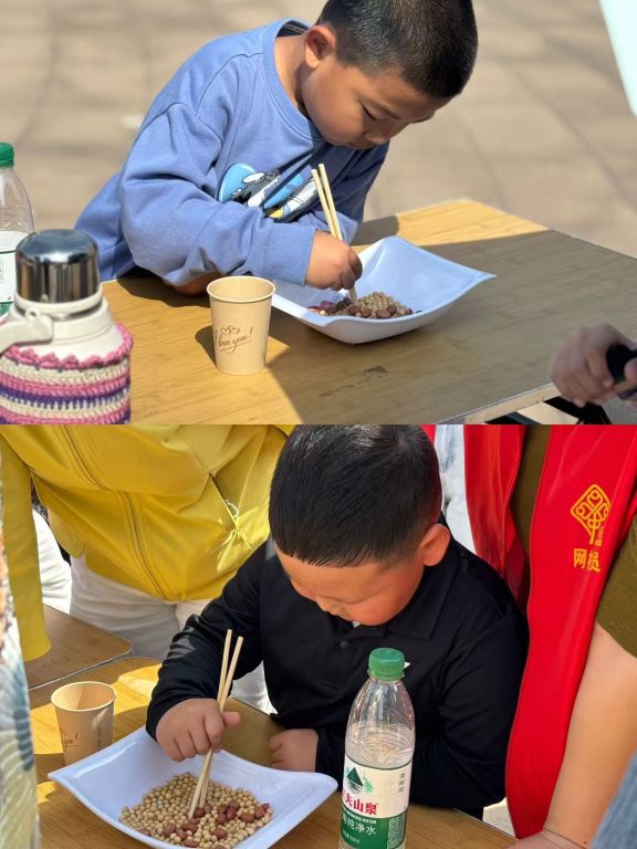 亲子接力比赛将活动推向了温馨的尾声。随着“三二一,开始”的口令响起,家长们迅速完成捏鼻转圈冲向孩子,孩子们快速将豆子夹到旁边的纸杯中奔向终点。那一刻,速度、耐力与爱心汇聚成一股强大的力量,推动着每一个家庭向前冲刺。