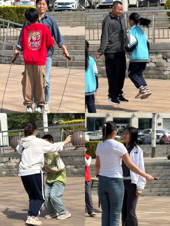 亲子跳绳比赛,爱与速度同频共振。家长和孩子们轻盈跳跃,绳子在空中画出一道道美丽的弧线尽显灵动与和谐。有的家庭轻盈如燕,有的家庭虽略显笨拙却乐趣无穷。