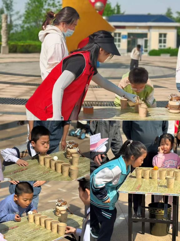 吹球过河环节,桌子上摆放一排装满水的杯子,随着工作人员一声“开始”,小朋友们猛地用力一吹,乒乓球瞬间像灵动的小精灵般,在水面上欢快地跳跃、穿梭,向着对岸“奔”去。