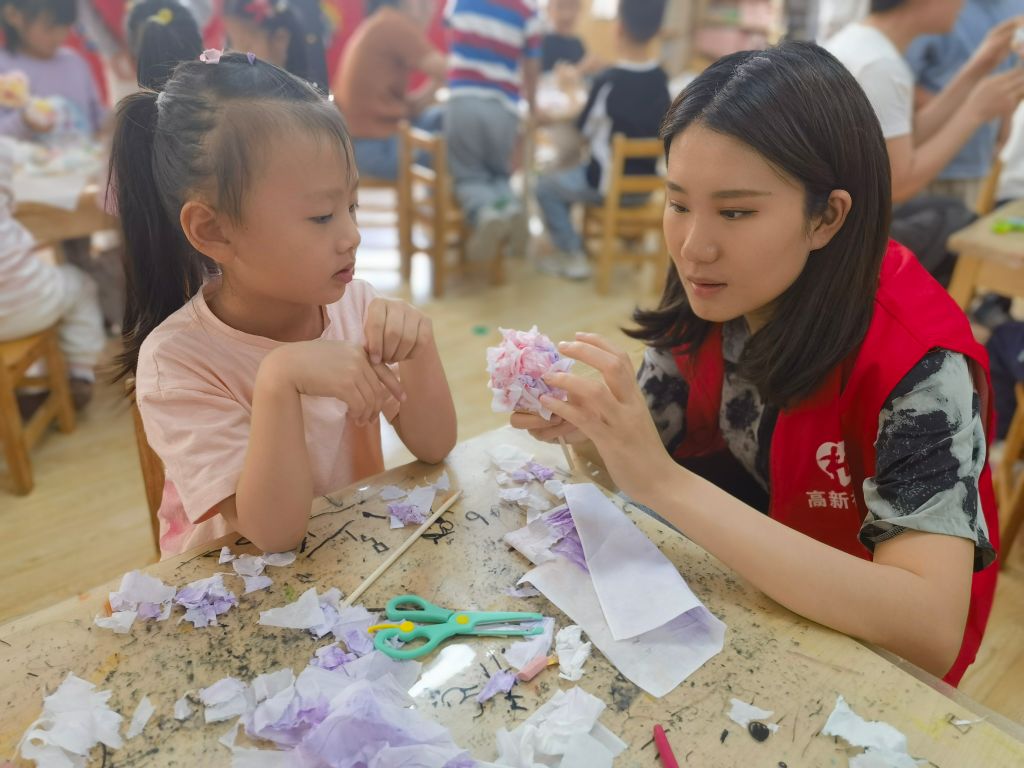 活动现场,孩子们精心制作妙趣横生的纸巾花瓣和DIY绣球花,将满满的爱意装进这些花朵中,作为母亲节礼物,表达对妈妈的深深爱意。社工们通过展示孕育过程的图片和提问环节,引导孩子们了解生命的奇迹,激发他们对妈妈的感恩之情。“有谁知道,宝宝出生前是在妈妈肚子里还是爸爸肚子里呀!”孩子们积极参与,回答生理问题,观看生育科普视频,深深感受到妈妈的伟大和爱的重要性。