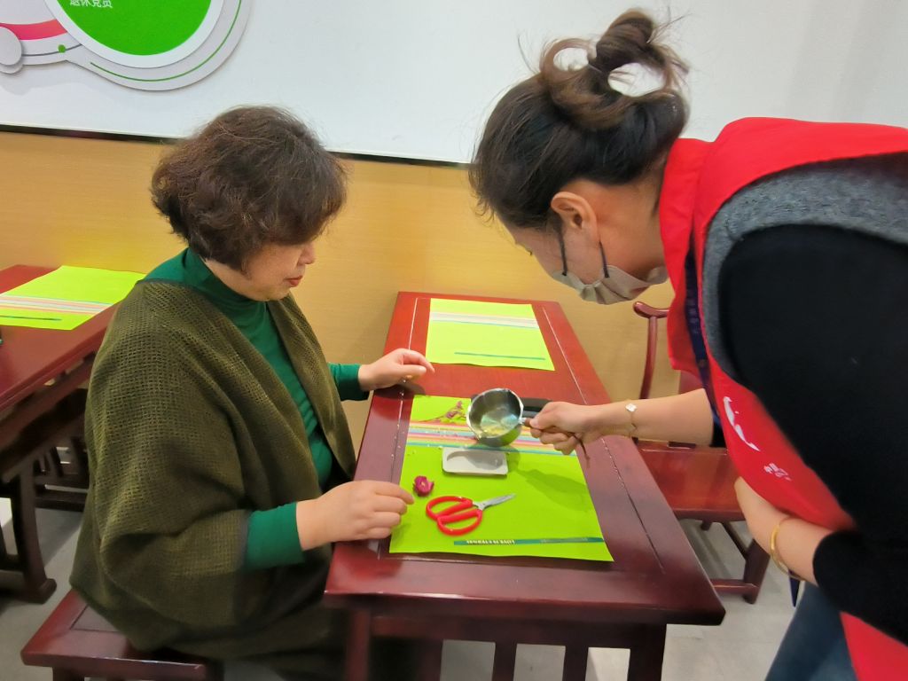活动伊始,一件件材料被有序的摆放在桌子上,社工向老人讲解香薰蜡牌的作用和制作流程。老人们通过构思造型、融化原蜡、滴入精油、加上各式干花点缀等步骤,随着蜡液在模具中冷却凝固,一个个精美的蜡牌制作完成。幽香的蜡牌加上各式干花的点缀,显得格外精致,每个人都拥有了一份属于自己的独特芬芳。看着自己的劳动成果,每个人脸上洋溢着快乐、幸福的笑容,体验着劳动创造美的乐趣,现场欢声笑语、气氛热烈。