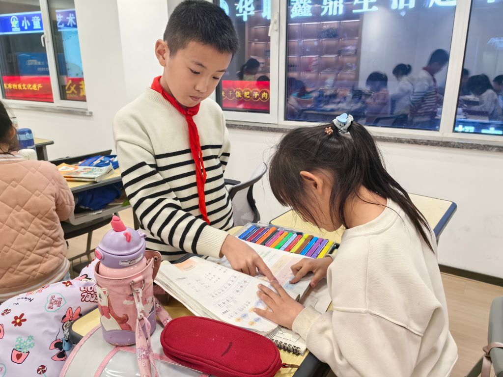 在社工的引导下,大桥街道社工站四点半课堂形成“大帮小”机制,社工鼓励高年级的儿童在完成自身学业任务后积极帮助低年级的儿童解答学习问题,鼓励低年级儿童在自己力所能及的范围内做有助于维护四点半课堂公共环境的事情。以四点半课堂自身为起点,引导儿童学会助人与利他。