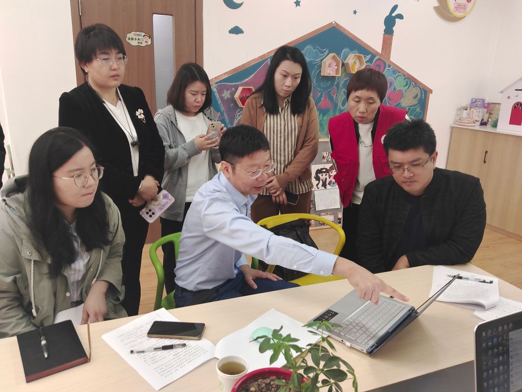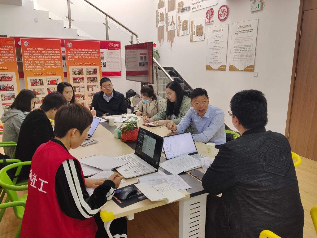 首先,杆石桥街道社工站汇报了当前的工作进度,就近期在服务开展过程中产生的疑惑与瓶颈问题进行提问。乔教授仔细阅览了社工站的档案材料,从需求为本的视角出发,带领社工再聚焦服务对象需求,引导社工就现有服务内容进行提炼总结。